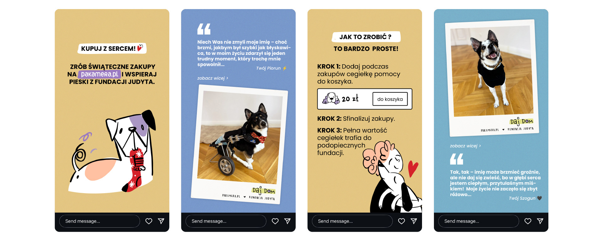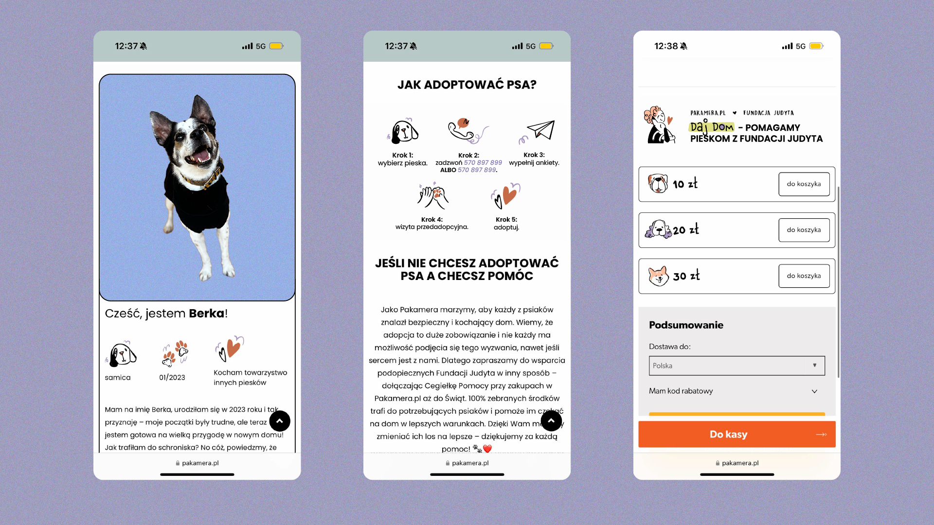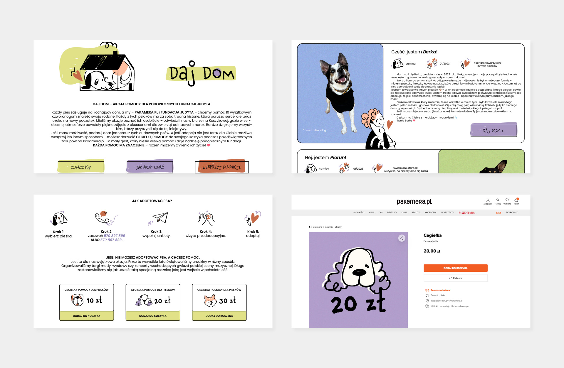 Pakamera.pl launched a special campaign titled "Daj Dom" (Give a Home) to encourage the adoption of pets and raise awareness about animal shelters. The project aimed to combine meaningful advocacy with visually appealing design to inspire action among visitors. I was tasked with creating the landing page design and the accompanying illustrations. The goal was to convey warmth, care, and urgency while maintaining the Pakamera.pl brand identity.