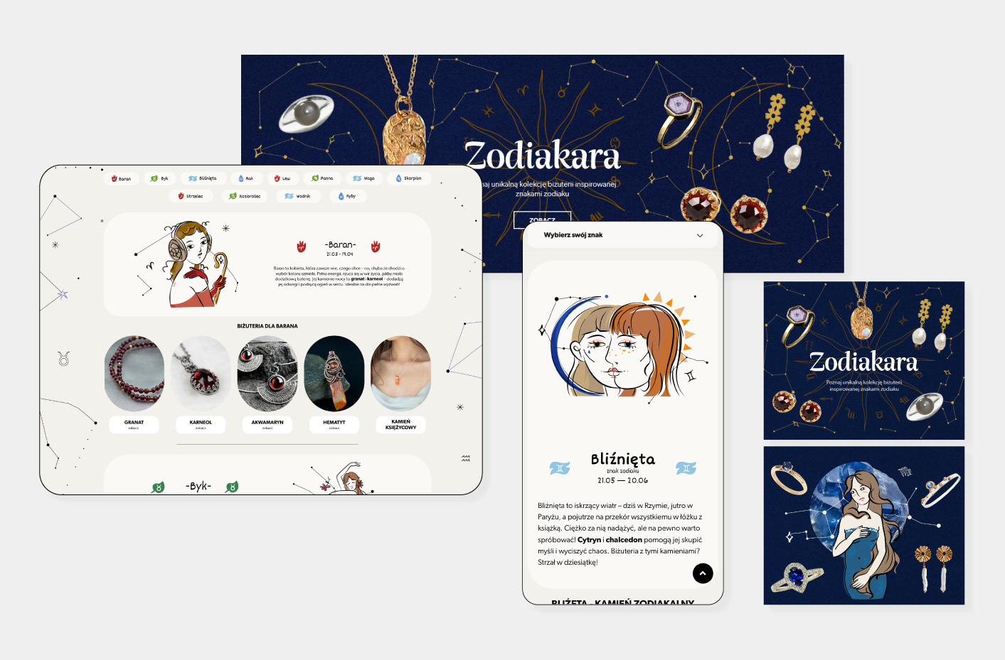 Zodiakara was a campaign promoting gemstone jewelry matched to each zodiac sign. I created the visual concept and illustration system, using astrological symbolism and a color palette aligned with the gemstones. The illustrations were designed to stay consistent with Pakamera’s core illustration style, as Zodiakara became a permanent section of the website within the Women category, while keeping the focus on the products.