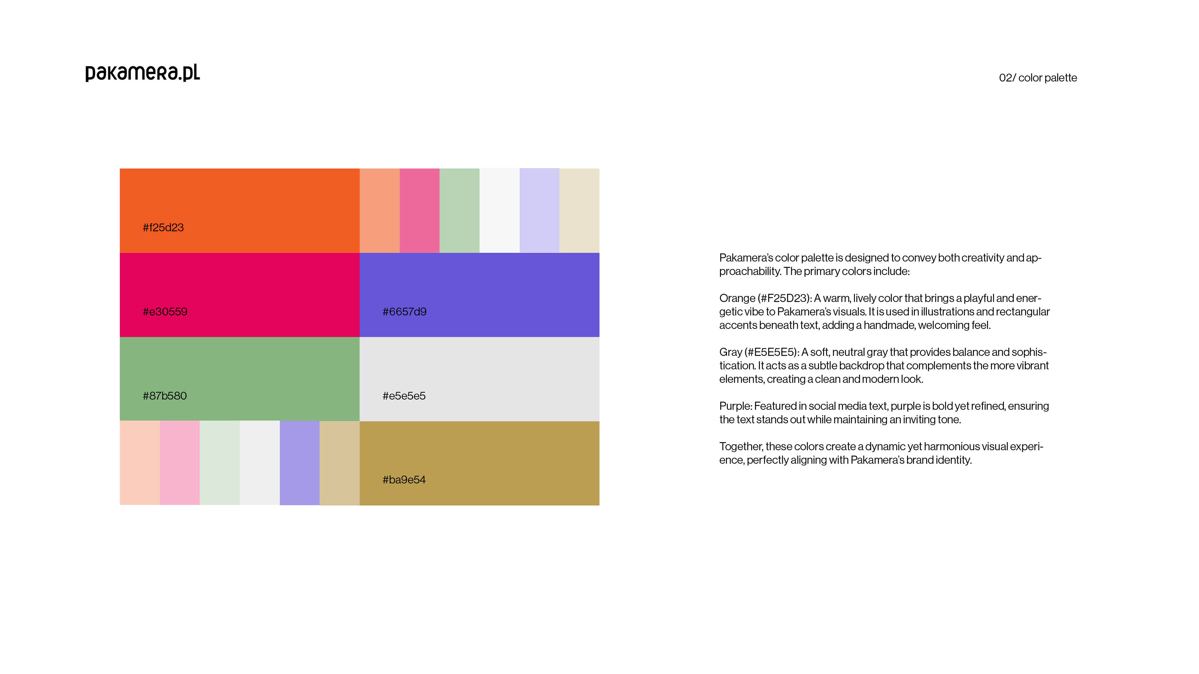 A refreshed visual base for Pakamera.pl — a logotype with flexible application rules and a bright, modern color palette reflecting the brand’s handmade, approachable character.
